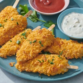 Can I freeze chicken on a stick? Totally. To freeze, after step 5 (see recipe card below), place chicken tenders on a sheet tray and freeze for 30 minutes. Transfer to a freezer bag, label and freeze up to 4 months. When ready to eat, follow steps 6-9 adding an additional 3-5 minutes to the cooking time. Do not defrost. These are a great alternative to store bought frozen chicken nuggets.