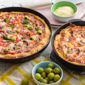 Sprinkle work surface lightly with flour, divide the dough in half and using your hands or a rolling pin, roll out the dough into an even circle. Leave the dough for a few minutes to rest and then roll out one more time to be 1 inch larger than the cast iron pans.