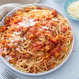 This Veggie Bolognese Sauce is a simple and quick recipe to get tons of vegetables in one delicious meal. It's super versatile and can be used on top of pasta, rice or even grilled chicken!