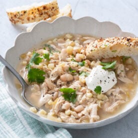Remove the chicken from the bone, chop into bite-size pieces, and add to the pot.